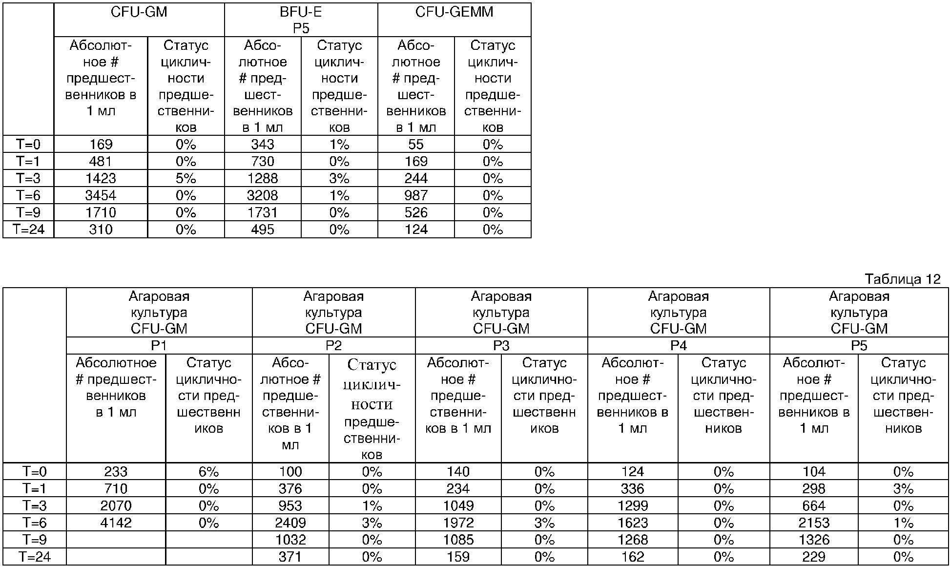 Точное количество нуклеарных клеток и клеток-предшественников в 1 мл крови и статус в кругу кровообращения (=% предшественников в фазе (S) синтеза ДНК клеточного цикла) предшественников для каждого из пяти доноров (#’s Р1, Р2, Р3, Р4 и Р5) представлено в таблицах 11 и 12.
