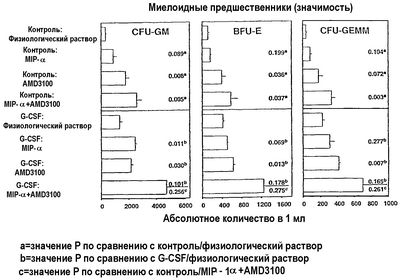 На фиг.1 представлен график получения миелоидных предшественников в ответ на лечение 1,1′-[1,4-фенилен-бис-(метилен)]-бис-1,4,8,11-тетраазациклотетрадеканом (AMD3100) в комбинации с макрофагальным белком воспаления после введения G-CSF.
