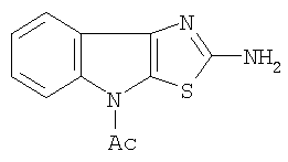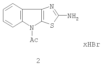 для защиты печени от отравления четыреххлористым углеродом. Указанное свойство позволяет предполагать возможность применения этого соединения для предотвращения и лечения у людей острых ингаляционных отравлений парами четыреххлористого углерода. Широкое применение четыреххлористого углерода в промышленности, сельском хозяйстве и военном деле делает актуальным поиск фармакологических средств, защищающих организм от воздействия этого токсиканта. Для восстановления функции печени применяют эссенциале, рибоксин и оротат калия, однако выбор гепатопротекторов невелик и их активность недостаточна. Ранее была установлена гепатопротекторная активность гидробромида 2-амино-4-ацетилтиазоло[5,4-b]индола (Патент 2076867 РФ, МКИ3 6 С07D 478/04, А61К 31/40.Гидробромид 2-амино-4-ацетилтиазоло[5,4-b]индола, защищающий печень от отравления четыреххлористым углеродом и способ его получения./ Вележева B.C., Мельман А.И.. Томчин А.Б., Смирнов А.В., Оковитый С.В., Гайворонская В.В. (РФ). – 5042409/04; Заявлено 19.05.92.), формула 2.