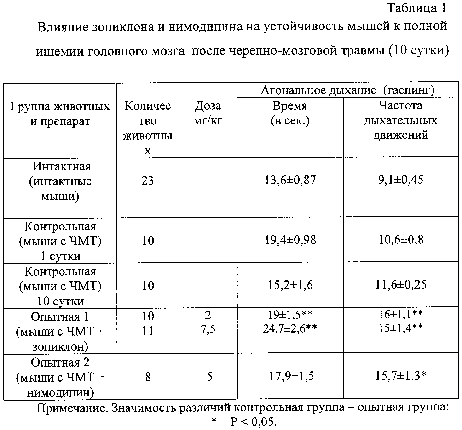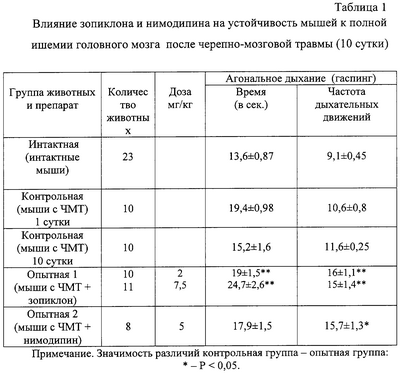 Предложено применение известного снотворного и модулятора активности ГАМК зопиклона в качестве лекарственного средства с многофакторным нейропротекторным действием на ишемию, гипоксию с гиперкапнией, судороги в острый период черепно-мозговой травмы. Изобретение обеспечивает профилактику вторичных осложнений, обусловленных черепно-мозговой травмой, и восстановление нервно-психического статуса. Показано, что в первые три дня пост-травматического периода зопиклон на 24,9-42,6% (против вазодилататора нимодипина или против антигипоксанта натрия оксибутирата) повышал устойчивость головного мозга при травме к ишемии, гипоксии, гиперкапнии и судорогам. 4 табл.