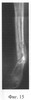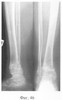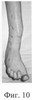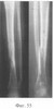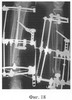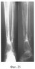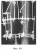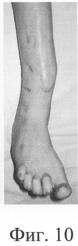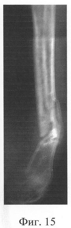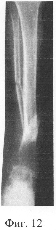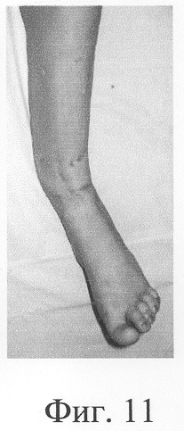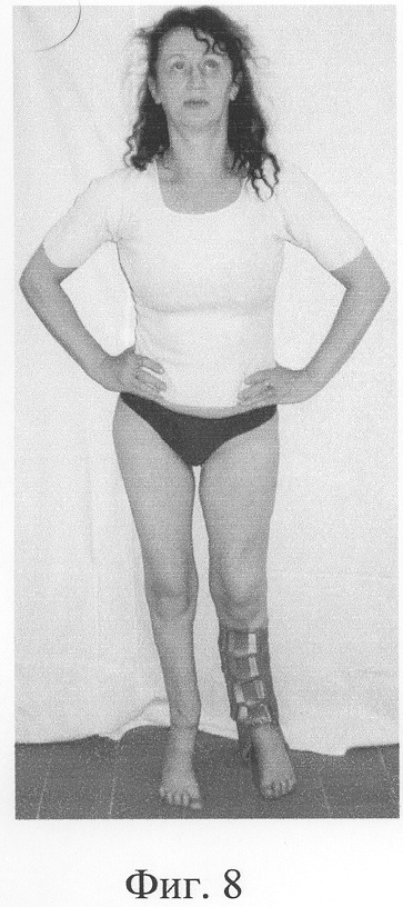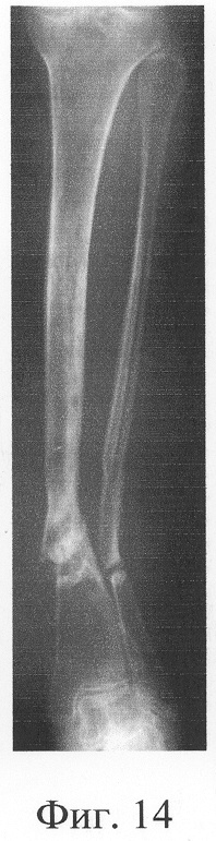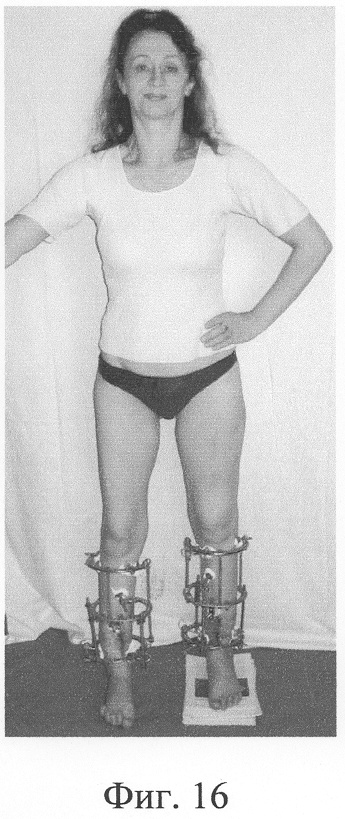 Больная П., 42 лет, поступила для оперативного лечения с диагнозом «атрофические ложные суставы обеих большеберцовых костей; сросшийся с укорочением 5 см перелом левой бедренной кости, хронический остеомиелит левой бедренной кости, фаза ремиссия; посттравматическая невропатия правого малоберцового нерва». В анамнезе – накостный, а затем дважды внеочаговый остеосинтез левой большеберцовой кости с исходом в ложный сустав; 4 операции внеочагового остеосинтеза правой большеберцовой кости, в том числе с костной пластикой; сроки фиксации в аппарате от 5 до 10 мес. Результат не достигнут: с обеих сторон сформировались ложные суставы (фиг.8-11 – клинические и фиг.12-15 – рентгенологические данные до лечения по предложенному методу).