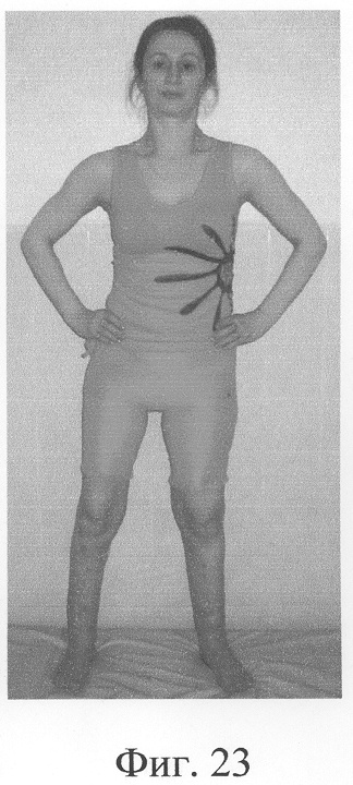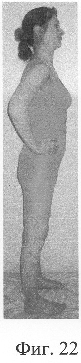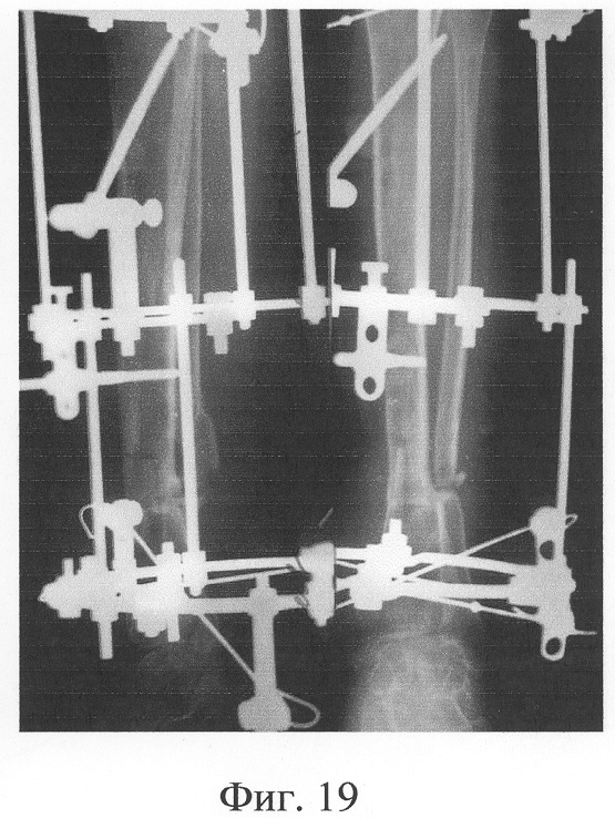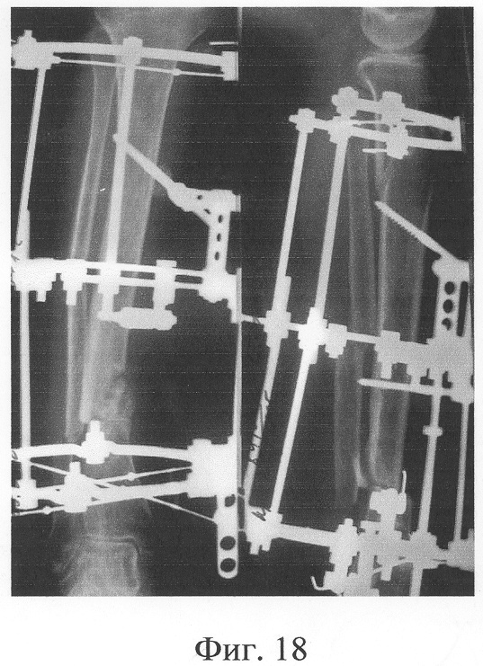 Одномоментно выполнены операции: резекция ложных суставов обеих большеберцовых костей, резекция левой малоберцовой кости, комбинированный чрескостный остеосинтез костей обеих голеней, костная пластика ложных суставов деминерализованным костным аллотрансплантатом из трубчатой кости, предварительно в лабораторных условиях заселенным аутологичными мезенхимными стволовыми клетками, выделенными из костного мозга пациентки, с плотностью заселения 7-10 млн на 1 см3 трансплантата. В послеоперационном периоде потребовалась дополнительная коррекция положения фрагментов на правой голени, что привело к смещению трансплантата из костного паза. Дренажи удалены на 3-е сутки, швы сняты на 15 сутки, антибактериальная терапия под контролем клинического фармаколога с учетом анамнеза. Ходьба с дополнительными средствами опоры с 7 суток послеоперационного периода. Компенсация укорочения бедра обувью (фиг.16-17 – клинические и фиг.18-19 – рентгенологические данные в процессе лечения, трансплантаты отчетливо видны на рентгенограммах, отмечается нарастание плотности костной ткани в области трансплантатов).