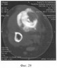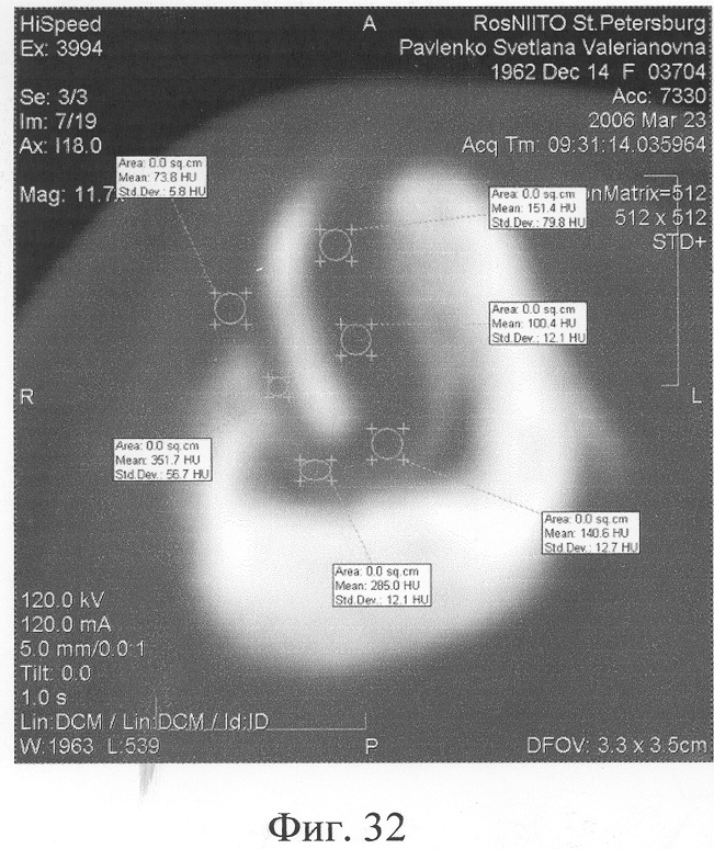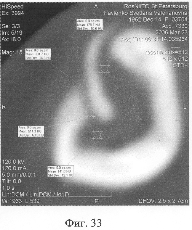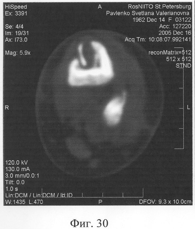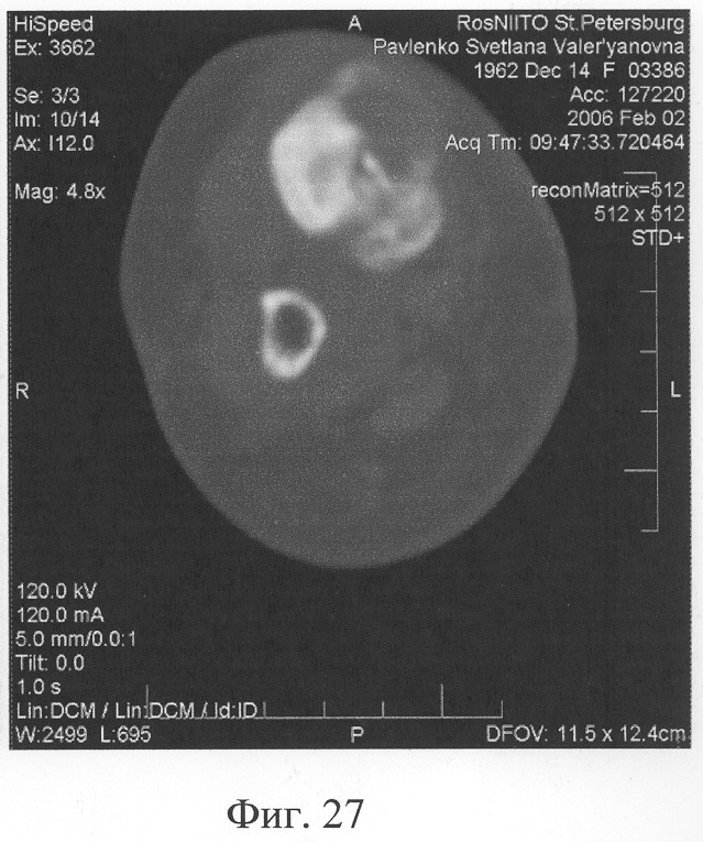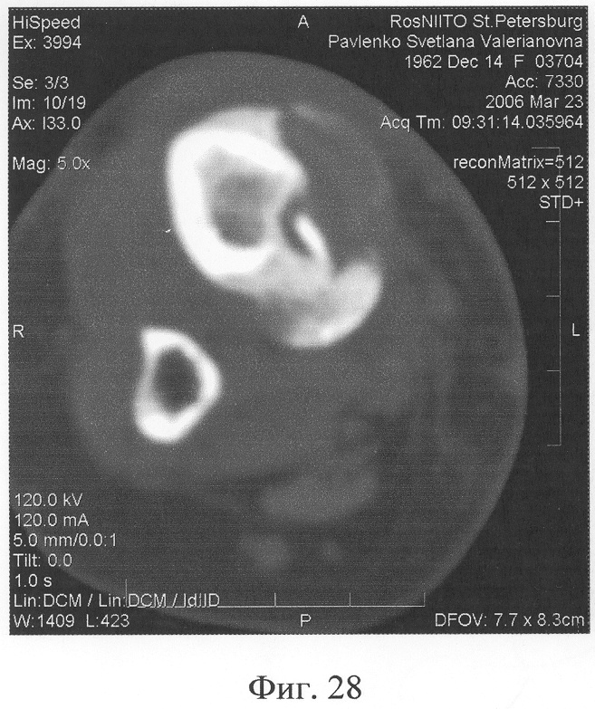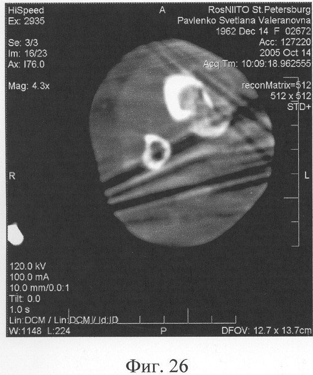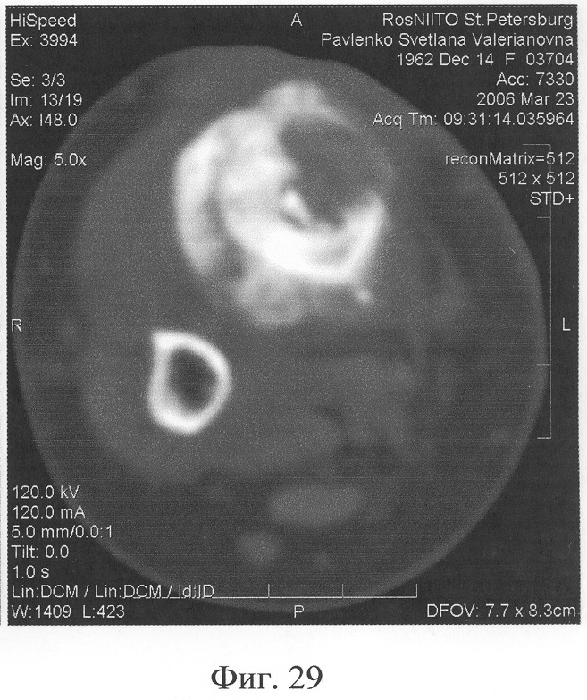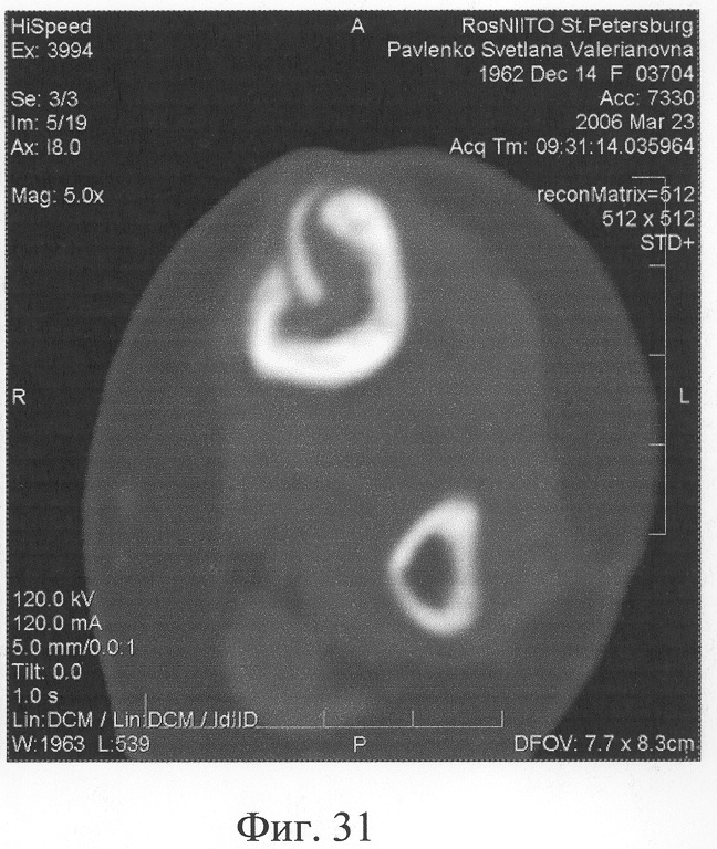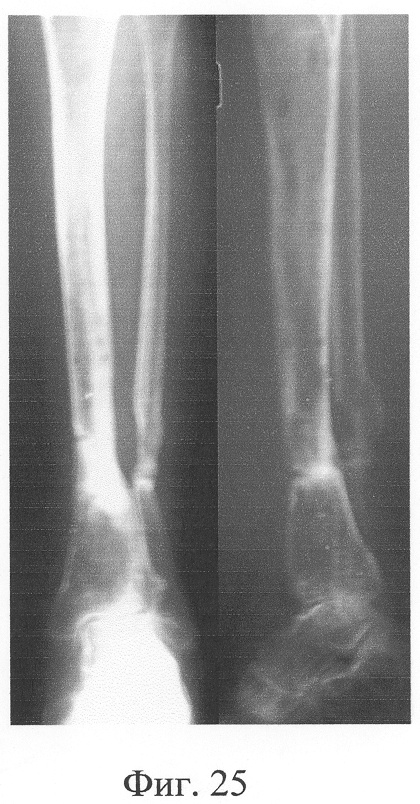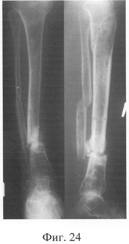 Аппарат внешней фиксации с левой голени демонтирован через 3 месяца после операции при клинико-рентгенологической картине сращения перелома. Аппарат внешней фиксации с правой голени демонтирован через 7 месяцев после операции при клинико-рентгенологической картине сращения перелома (фиг.20-25 – результат лечения). При рентгенологическом и томографическом контроле в трансплантатах отмечалось постепенное нарастание плотности костной ткани с формированием костной мозоли на всем протяжении между трансплантатом и костными фрагментами (фиг.26-29 – динамика данных компьютерной томографии правой голени: отмечается нарастание плотности костной ткани в области трансплантатов и формирование регенерата между смещенным трансплантатом и костными фрагментами; фиг.30-33 – динамика данных компьютерной томографии левой голени: отмечается нарастание плотности костной ткани в области трансплантатов и формирование регенерата между трансплантатом и костными фрагментами).