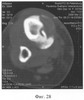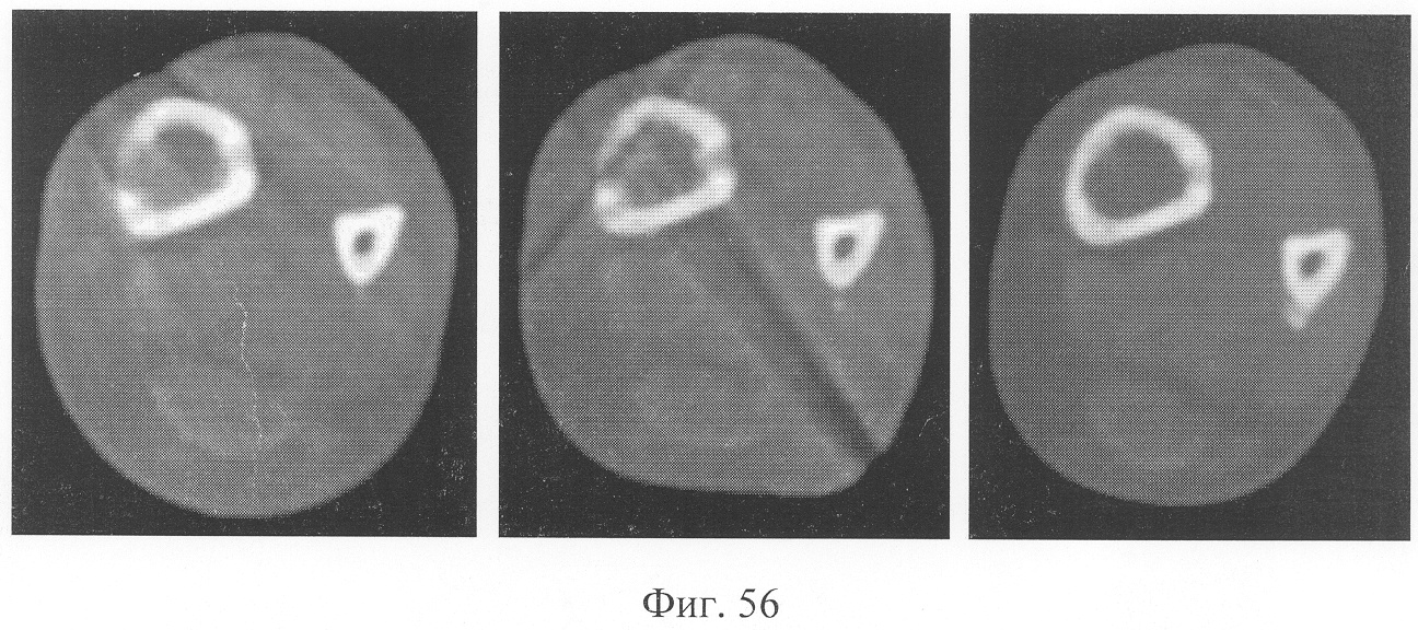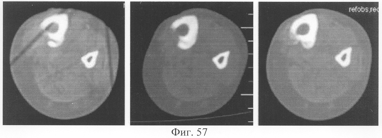 При оценке результатов томографического исследования в динамике отмечено быстрое нарастание плотности костной мозоли между дистальным и проксимальным фрагментами (фиг.56 – динамика томографической картины на уровне контакта костных фрагментов), что позволяет говорить об остеоиндуктивном воздействии предложенного биотрансплантата. В то же время в области трансплантата также отмечены очаги остеогенеза с нарастанием их плотности в динамике и включением в костную мозоль (фиг.57 – динамика томографической картины на уровне трансплантата).