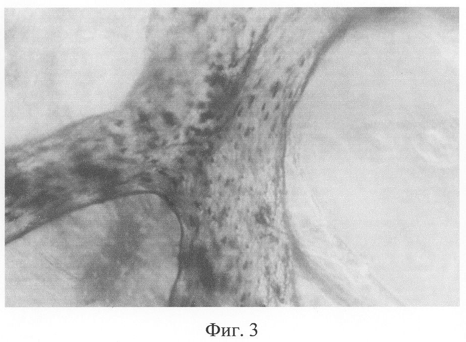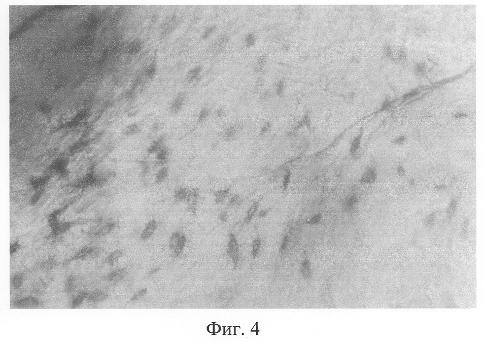 Из костного мозга пациента выделяют аутологичные мезенхимные стволовые клетки фенотипа: CD 34-; CD 45-; CD 44+; CD 90+; CD 105+; CD 106+. Биотрансплантат из ДКТ и выделенных МСК готовят заранее. В лабораторных условиях ДКТ отмывают в растворе Хенкса в течение 24-48 часов, что обеспечивает РН среды для дальнейшей работы с жизнеспособным клеточным материалом, и помещают в среду с аутосывороткой. На трансплантат наносится суспензия подготовленных аутологичных мезенхимных стволовых клеток. Заселение трансплантата клетками проводят до достижения необходимой плотности клеток в 1 см3, т.е. оптимальной плотности заселения для получения очагов костеобразования. Заселение трансплантата производится в течение 24-72 часов (в зависимости от размеров трансплантатов от 15 до 40 см3) с плотностью 7-10 млн на 1 см3 трансплантата (фиг.3-4).