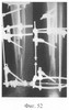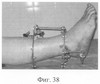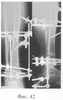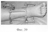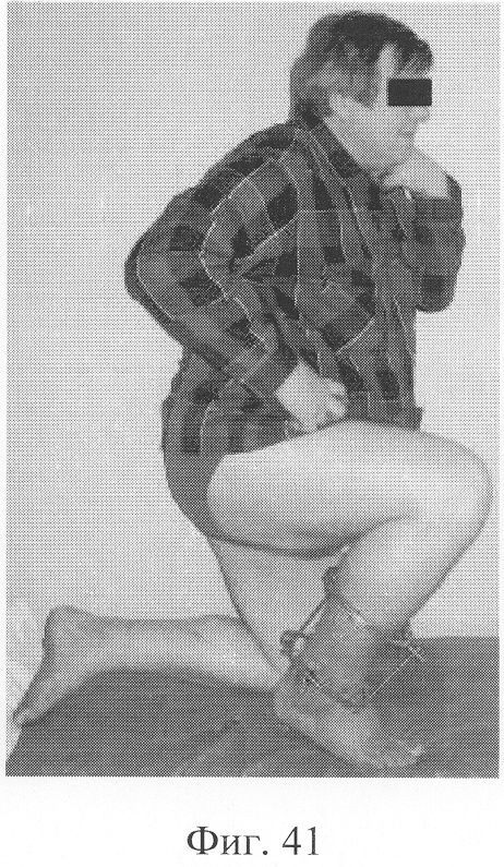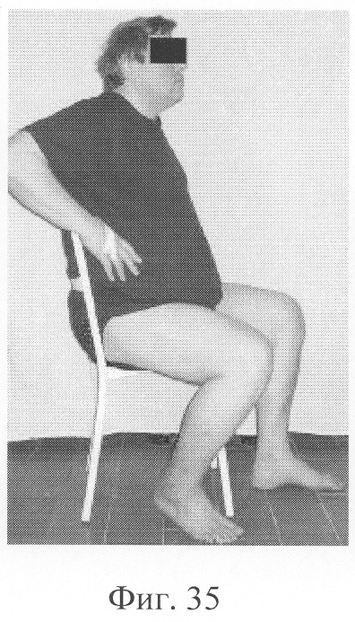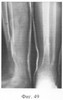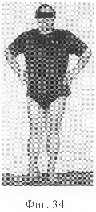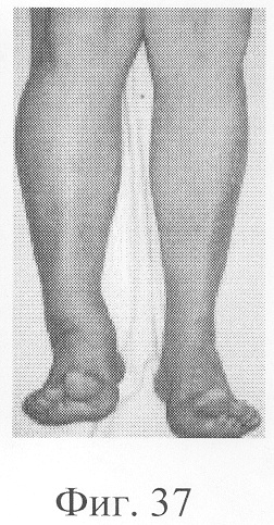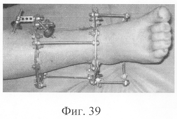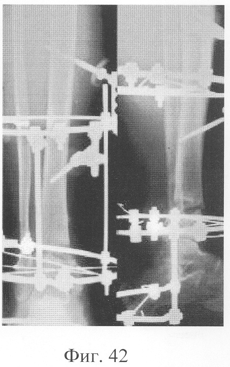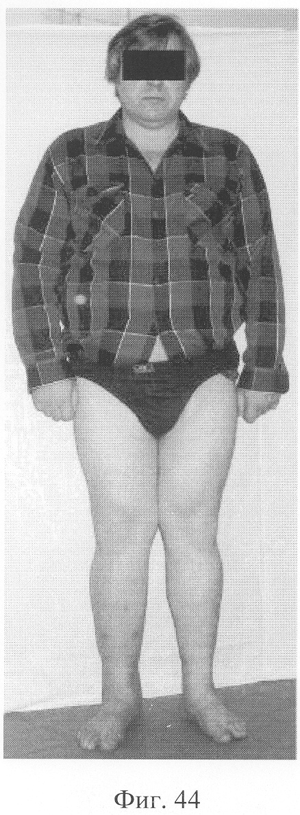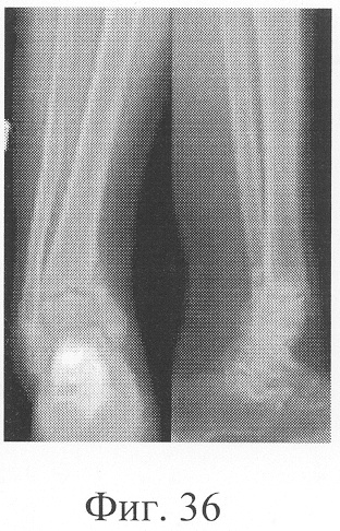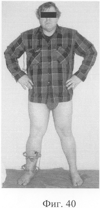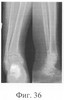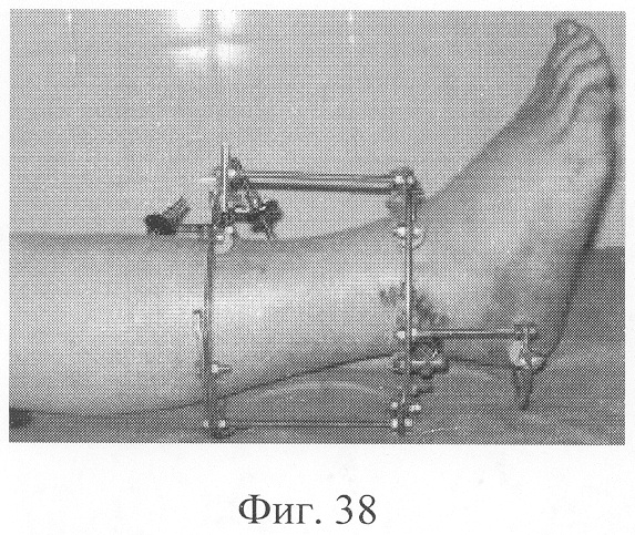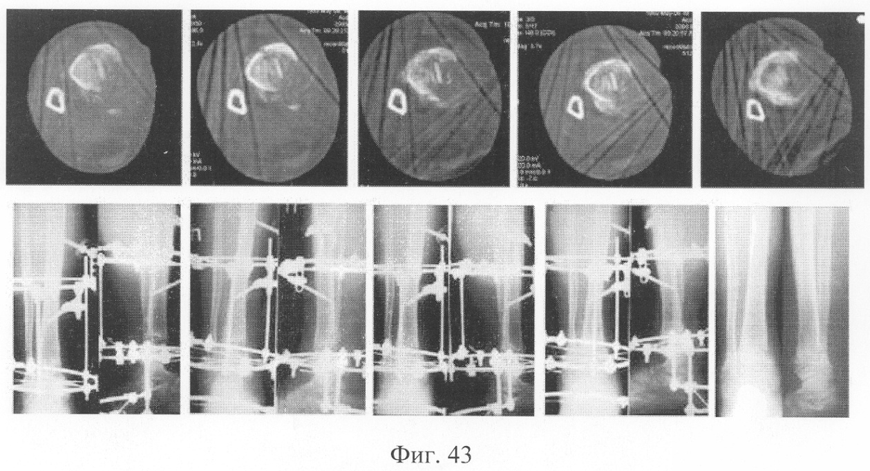 Больной Р., 46 лет, поступил для планового оперативного лечения с диагнозом «ложный сустав правой большеберцовой кости с варусно-антекурвационной деформацией» (фиг.34-37 клинико-рентгенологические данные до операции). Предшествующее лечение перелома проводилось консервативным способом, можно отметить несостоятельность и недостаточную продолжительность иммобилизации, что является у данного пациента основным фактором в формировании ложного сустава. Из сопутствующей патологии необходимо отметить гипертоническую болезнь II ст., ИБС, атеросклеротический кардиосклероз, НК II А ст. Во время операции произведена экономная резекция фрагментов, устранение деформации в аппарате внешней фиксации, костная пластика деминерализованным костным трансплантатом, заселенным аутологичными мезенхимальными стволовыми клетками, по предложенной методике (при этом костный паз был выполнен по внутренней поверхности в области диастаза между костными фрагментами). В послеоперационном периоде дренажи удалены на 2-е сутки, швы сняты на 21 сутки в связи с развитием краевого некроза в области послеоперационной раны. Ходьба при помощи костылей с 7-х суток послеоперационного периода, дозированная нагрузка на конечность с третьего месяца после операции с учетом локализации повреждения в дистальной части большеберцовой кости (фиг.38-42 – клинические и рентгенологические данные в процессе лечения). Из осложнений необходимо отметить воспаление в области чрескостных элементов в конце периода фиксации, что купировано после снятия аппарата. Демонтаж аппарата внешней фиксации через 5,5 месяцев при клинико-рентгенологической картине сращения.