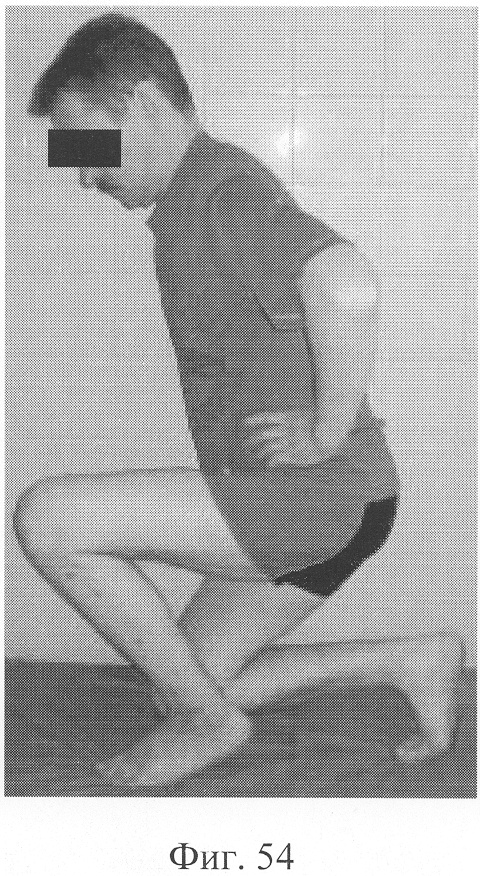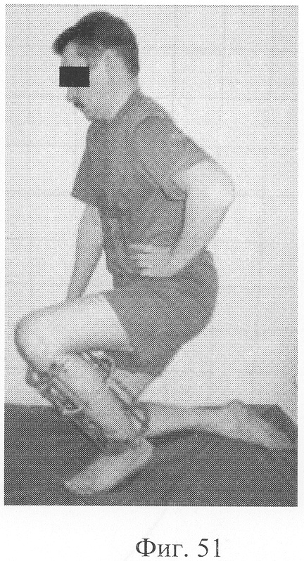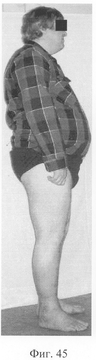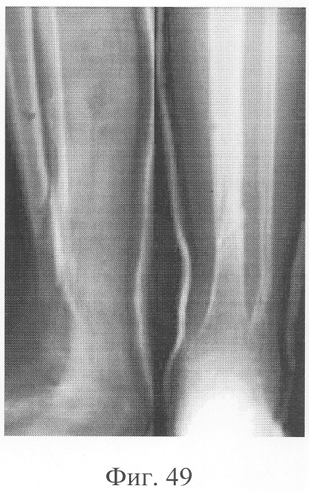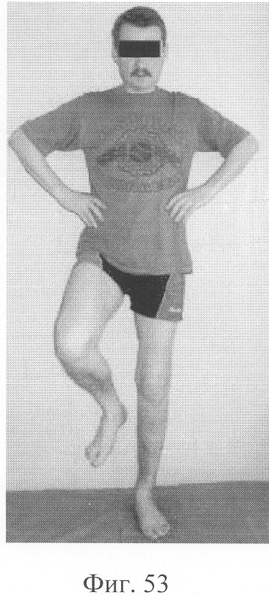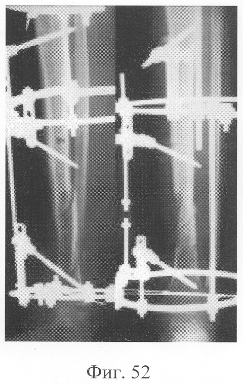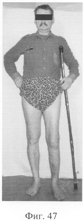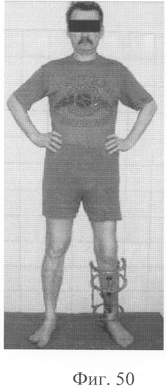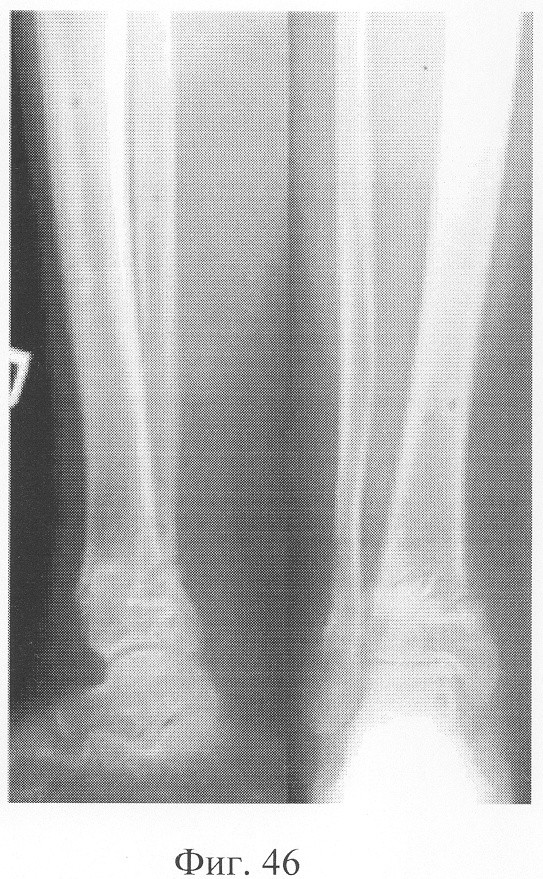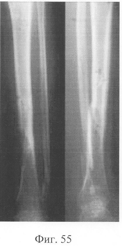 Больной П., 46 лет, поступил для планового оперативного лечения с диагнозом «ложный сустав левой большеберцовой кости» (фиг.47-49 – клинические и рентгенологические данные до операции). В анамнезе открытый перелом обеих костей голени, по поводу которого после проведения первичной хирургической обработки раны был наложен аппарат внешней фиксации с одномоментной репозицией. В связи с замедленной консолидацией проводилась микрокомпрессия и микродистракция, что не имело четкого положительного эффекта. Через 11 месяцев после травмы отмечалась выраженная патологическая подвижность при клинической пробе, рентгенологически отмечены признаки формирования ложного сустава. Аппарат внешней фиксации был демонтирован, и после заживления ран выполнена операция: экономная резекция костных фрагментов, фиксация в аппарате, костная пластика деминерализованным костным трансплантатом, заселенным аутологичными мезенхимальными стволовыми клетками по предложенной методике. В послеоперационном периоде дренажи удалены на 2-е сутки, швы сняты на 14 сутки, с 5-х суток разрешена ходьба при помощи костылей, с 7-х суток нагрузка на оперированную конечность (фиг.50-52 – клинические и рентгенологические данные в процессе лечения). Аппарат внешней фиксации демонтирован через 3 месяца при клинико-рентгенологической картине сращения (фиг.53-55 – результат лечения).