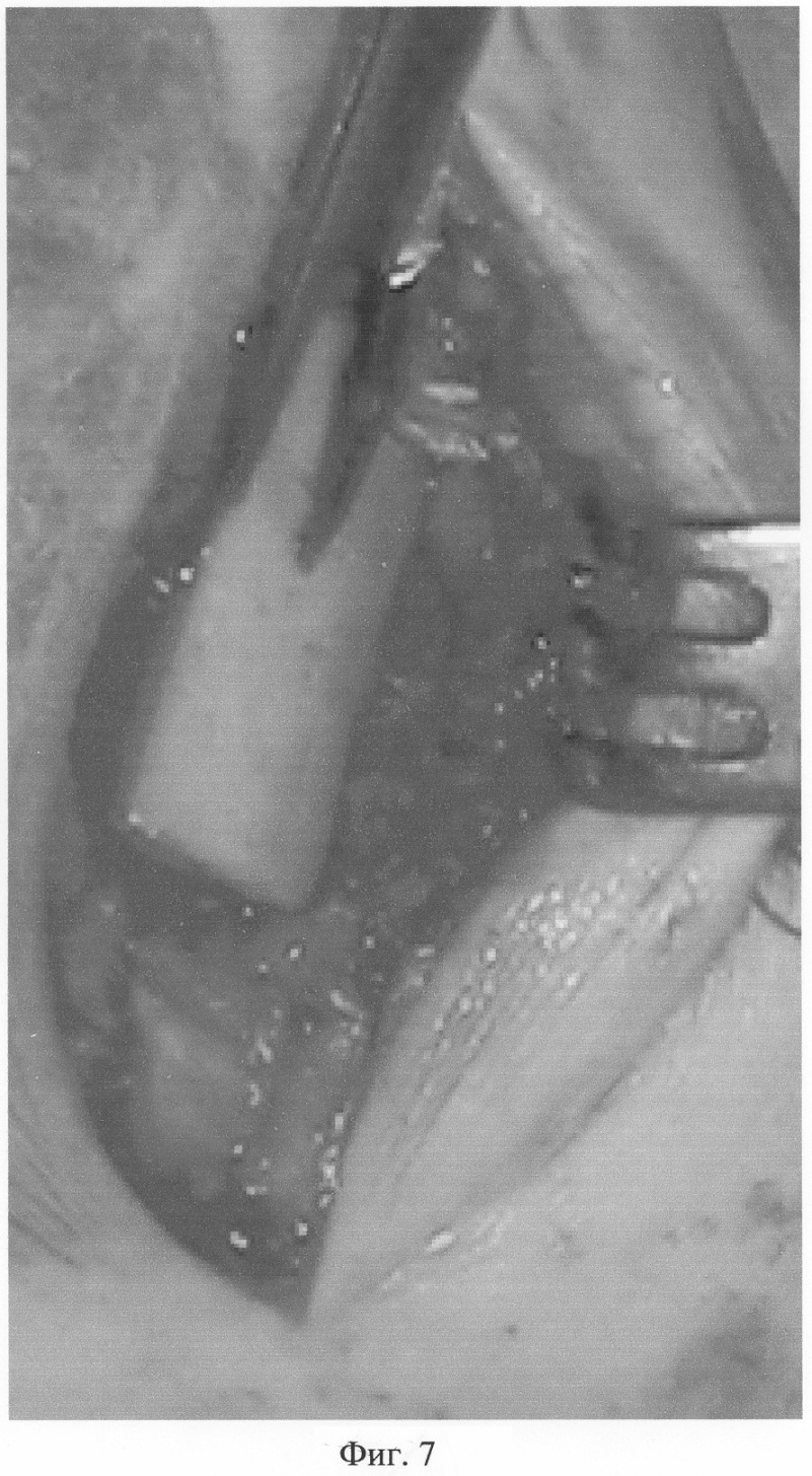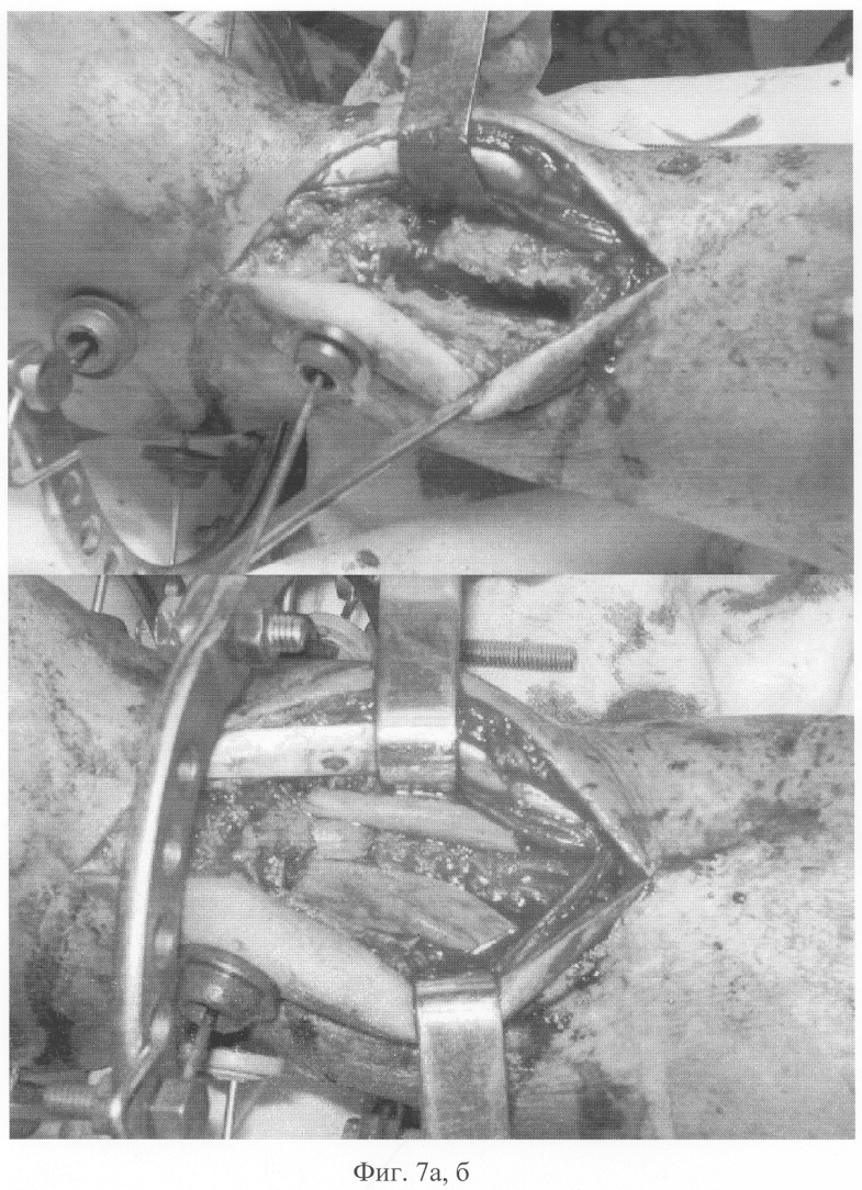 Операция выполняется под спинномозговой анестезией. После резекции ложного сустава или экономной резекции рубцовой ткани и склерозированных участков костных фрагментов до кровоточащей кости и открытой адаптации через проксимальный и дистальный отломок формируют паз размером до 5×1,5 см на всю толщину кортикального слоя, в который помещают подготовленные биотрансплантаты (при необходимости адаптации подготовленные трансплантаты рассекают на фрагменты), перекрывая зону ложного сустава (фиг.7, 7а, 7б), с заполнением костномозгового канала на этом уровне.