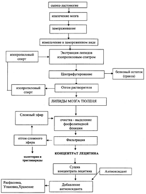 1. Способ получения лецитина, включающий измельчение головного мозга тюленя, экстракцию органическим растворителем, очистку полученного экстракта от примесей и выделение лецитина, отличающийся тем, что головной мозг тюленя перед измельчением замораживают до температуры – 25÷30°С, измельчение проводят в режущем устройстве с частотой вращения рабочего органа 4400-4500 об/мин до размера частиц 1-2 мм, экстракцию проводят изопропиловым спиртом при температуре 50-70°С при перемешивании в течение 20-30 мин, при этом измельченный головной мозг тюленя и изопропиловый спирт берут при соотношении 1:3-1:5 соответственно, а очистку полученного экстракта ведут от 10 до 30 мин сложным эфиром при температуре от – 20°С до + 20°С при соотношении 1:2-1:10 соответственно с последующим выделением лецитина.