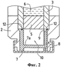 Приемник 7 в данном случае внешне имеет цилиндрическо-коническую форму и содержит центральное глухое отверстие 10, в котором будет располагаться нижняя заглушка 5. По окружности приемника расположены три инжекционные трубки, одна из которых (обозначена цифрой 8) видна на данном разрезе. Диаметр глухого отверстия равен диаметру емкости. Длина глухого отверстия 10 равна высоте нижней заглушки 5, находящейся в емкости 3. После занятия нижней заглушкой 5 своего положения на основании 7а (фиг.2) приемника впускное отверстие 9 на боковой стороне емкости 3 инжекционных трубок 8 вступает в соприкосновение с жидкостью 6. Жидкость вытекает со скоростью, соответствующей силе давления, возникающего в результате перемещения верхней заглушки 4.
