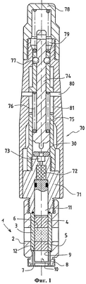После снятия крышки асептики и наложения нижней части инъекторного устройства на кожу пациента оператору следует нажать пальцем на толкатель 78, который перемещается внутрь и сжимает пружину 76. Толкатель перемещается в положение, в котором выемка 79 становится на уровне паза ударника 74, при этом шарики, например, 77, удерживая ударник 74, смещаются в паз 79 и высвобождают ударник, который с силой ударяет по капсюлю-воспламенителю 73, инициирующему воспламенение пиротехнического заряда 72. Ударник 74, упираясь в держатель капсюля, обеспечивает расположение на месте капсюля и герметичность, при этом газы, образующиеся в результате сгорания, не поднимаются в направлении толкателя.