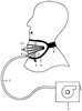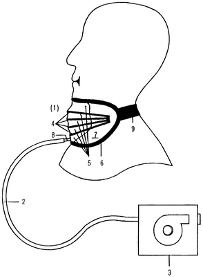 Устройство в качестве примера состоит из ошейника 1, отсасывающей трубки 2 и всасывающего насоса 3. Ошейник 1 представляет собой полуоткрытую камеру, которая в форме купола охватывает переднюю (вентральную) шейную область. Край ошейника 1 проходит от подбородка вдоль обеих сторон нижней челюсти к боковым сторонам шеи, а оттуда – снова вперед и вниз до верхнего конца грудины. Вдоль контура расположено уплотнительное устройство 6, которое при пользовании аппаратом прилегает к коже. Таким образом, открытая сторона ошейника 1 закрывается кожей пациента, и образуется закрытый камерный объем 7.