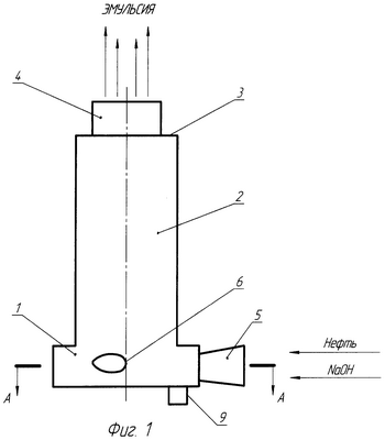 Соответствующие компоненты и реагенты будущей смеси через патрубок 5 и отверстие 6, образованное в боковой стенке камеры 1, поступают внутрь камеры, создавая в ней турбулентное вихревое движение. В результате этого в центральной части камеры 1 над донной ее частью образуется кавитационная каверна, в которой создается давление ниже атмосферного.