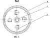 На фиг.1 показана конструкция роторно-пульсационного аппарата с направляющими лопастями. Он состоит из корпуса 1, в котором имеются четыре лопасти полусферической формы 2, установленные у отверстий ротора 3. Статор с прорезями 4 жестко закреплен на крышке 5. В состав аппарата входят набор регулировочных шайб 6, расположенных на валу 7. Имеются патрубки 8 и 9 для ввода и вывода компонентов. В рубашку 10, через входной патрубок 11 подается хладоноситель для поддержания заданной температуры и выводится через выходной патрубок 12. В аппарате имеется рабочая полость 13, которая расположена между стенкой и зубьями, нижняя часть рабочей области 14 и внешняя полость аппарата 15. На фиг.2 изображен вид сверху ротора 3, насаженного на вал 7. У отверстий основания ротора 3 установлены лопасти полусферической формы 2.