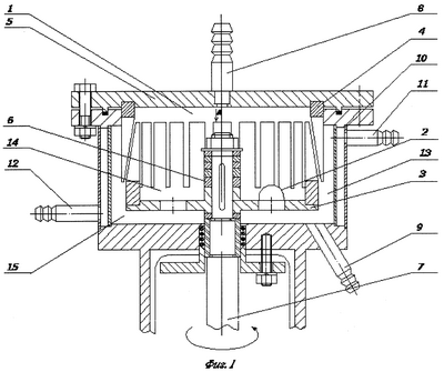 Аппарат работает следующим образом. Обрабатываемая жидкая среда через входной патрубок 8 поступает в центральную часть устройства, где за счет центробежных сил, создаваемых вращающимся ротором, проходит в зазор между ротором 3 и статором 4. Проходя последовательно через радиальный зазор между ротором и статором, жидкая среда подвергается механическому воздействию со стороны элементов конструкции аппарата: за счет удара частиц об образованные прорезями зубья ротора и статора, лопастей полусферической формы 2, установленных у отверстий основания ротора, а также сдвиговых напряжений, возникающих в зазоре. Эти воздействия приводят к гомогенизации, растворению, измельчению, диспергированию, в жидких многокомпонентных системах. В процессе вращения ротора происходит периодическое перекрывание прорезей, вследствие чего возникает гидравлический удар и генерирование низкочастотных колебаний. Таким образом, на обрабатываемую среду происходит наложение упругих колебаний.