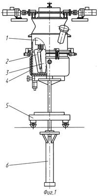 На фиг.2 изображено устройство для установки и снятия мешалок в положении, предшествующем установке мешалок. Устройство состоит из основания 7, которое выступами 8 центрируется в посадочном кольце 9 тележки, предназначенном для установки сменной чаши. Для вертикального перемещения мешалок на водиле 10 устройства установлены винтовые домкраты 11, 12, размещенные по вертикальным осям ограждения 13 мешалок. В нижней части основания 7 выполнено посадочное место для головки штока гидроцилиндра 6 (фиг.1).