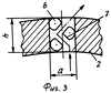 Устройство, реализующее указанные режимные параметры, представлено на фиг.1. В разрезе изображены фрагменты ротора 1, статора 2, камеры озвучивания 3, каналы 4 в роторе 1 и каналы 5 в статоре 2. В каналах 5 статора расположены стержни 6. Оси первых стержней 6, расположенных по одну сторону от оси каналов 5, смещены от оси каналов 5 на величину 1 и оси вторых стержней 6, расположенных по другую сторону от оси каналов 5, смещены на такую же величину от оси каналов 5. Указанные первые и вторые стержни 6 отстоят от соответствующей противоположной боковой стороны канала 5 на величину 2 (указана на фиг.2), соизмеримую с шириной каналов 4 в роторе 1. Между каждым указанным первым стержнем 6 и каждым указанным вторым стержнем 6 имеется зазор 3 в виде щели, варьируя шириной которого можно изменять скорость потока жидкой среды при прохождении канала 5 в статоре.