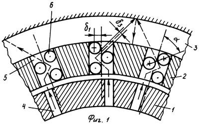 Ширина а и длина h канала 5 определяется посредством заданных радиуса стержней 6, величин 1, 2, 3 и угла между осью канала 5 и линией, соединяющей центры стержней 6, лежащие по разные стороны от оси канала 5. Расстояние 2 между стержнем 6 и противолежащей боковой стороной канала 5 соизмеримо с шириной канала 4 в роторе.