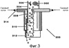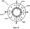 На фиг.4 показан вид сверху-снизу воздушного ножа 300, показанного на фиг.3. Как видно на фиг.4, воздушный нож 300 имеет четыре газозаборника. Воздушный нож 300 также содержит ряд болтов 316. Болты 316 в данном варианте осуществления настоящего изобретения используются для крепления воздушного ножа 300 к суспензионной емкости. Однако другие способы присоединения воздушного ножа к суспензионной емкости входят в объем настоящего изобретения. На фиг.4 также показано отверстие 318 в центре воздушного ножа 300, через которое проходит циклонная пыль на своем пути в суспензионную емкость. Воздушный нож согласно настоящему изобретению успешно используется на входе в суспензионную емкость в способе получения TiCl4 без необходимости дополнительной вентиляции в суспензионной емкости.