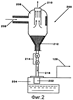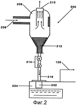 На фиг.2 показано устройство 200 с воздушным ножом 202 согласно настоящему изобретению в сочетании с циклонным сепаратором 206 и суспензионной емкостью 204. Газы, содержащие твердые частицы, поступают в циклонный сепаратор 206 через тангенциальный впуск 208. Внутри циклонного сепаратора 206 твердые частицы и газы разделяются. Газы выходят из циклонного сепаратора через газовую выпускную трубу 210, и сила тяжести заставляет твердые частицы собираться на дне 212 циклонного сепаратора 206. Буферное разгрузочное ответвление с двумя задвижками 214 минимизирует количество газа, которое сбрасывается вместе с циклонной пылью. Труба 216 соединяет буферное разгрузочное ответвление 214 с воздушным ножом 202. Циклонная пыль, которая сбрасывается из буферного разгрузочного ответвления с двумя задвижками 214, падает через трубу 216 и через воздушный нож 202 в суспензионную емкость 204.