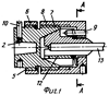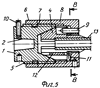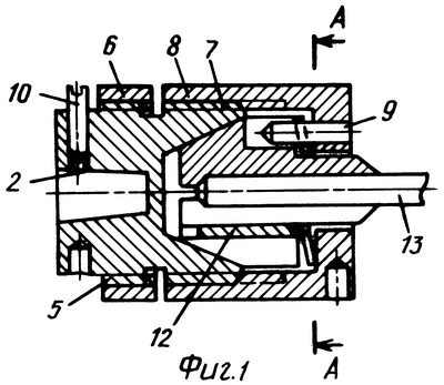 Между внутренним торцом зажимной гайки 8 и торцом зажимных кулачков 4 с отверстиями или прорезями вверху расположена тарельчатая пружина 11, постоянно поддерживающая контакт с конусной поверхностью отверстия 3 и с конусными участками зажимных кулачков 4, а для разжима которых, в их прорезях расположены упругие резиновые прокладки 12.