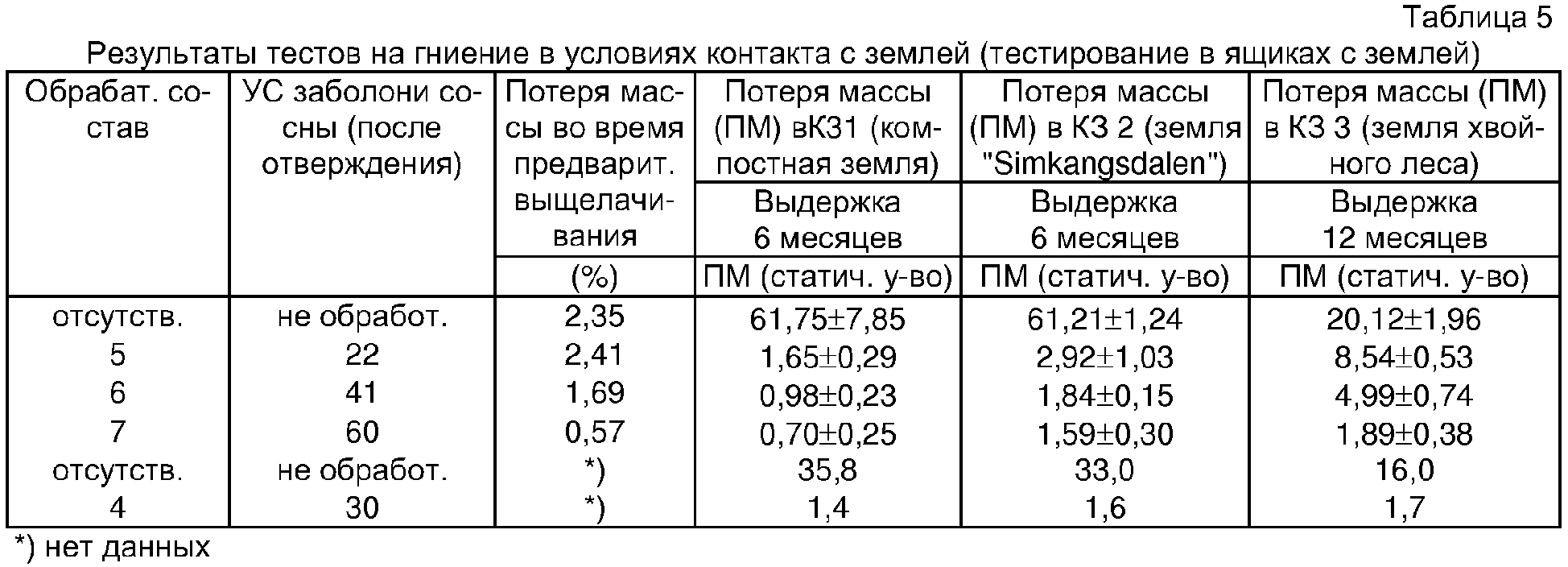 Представленные в Таблице 3 данные показывают, что в результате обработки твердость, прочность на изгиб и модуль упругости немного увеличиваются, в то время как ударная прочность уменьшается. Однако при высоких уровнях разбавления ФС (при использовании обрабатывающего состава №5) это уменьшение незначительно. Стойкость к гниению Величины потери массы (см. Таблицу 4) для каждого грибка и двух пород древесины позволяют согласно EN 113 отнести обработанную древесину к интервалу от “стойкой” до “высокостойкой”. Как показано в Таблице 5, величины потерь массы вследствие гниения в условиях контакта с землей (КЗ) демонстрируют еще более однозначное проявление высокой стойкости к микробиологическому гниению. К тому же КЗ-тесты по сравнению с тестом EN 113 ближе к реальной действительности.