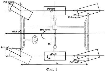 Основной поворачивающий момент (Мпов ук) (фиг.1) формируется за счет действия равнодействующих, представляющих собой векторную сумму проекций на поперечную ось У сил тяги на управляемых колесах передней (Рк1 заб и Рк1 отст) и задней (Рк2 заб и Рк2 отст) осей на плече, равном базе машины (L).