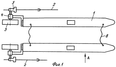 Лопастное колесо 3 может быть заменено на винт и присоединено к приводу через зубчатую передачу с коническими колесами. Лыжа 1 должна быть изготовлена из легких и прочных материалов, например из легких пород дерева, армированного пенопласта и др. При использовании надувных воздухом конструкций оболочке должна быть придана соответствующая форма, не изменяющаяся под действием сжатого воздуха, для чего конструкция предусматривает усиление в виде каркаса по граням, стыкам, а горизонтальные и вертикальные плоскости через внутреннюю полость соединяются нитями и стержнями с определенным шагом. Стержни в виде трубок устанавливают в месте размещения лыжного крепления. Одна лыжа 1 должна обеспечить устойчивость на воде при условии