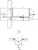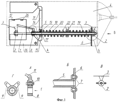 Фиг.1 иллюстрирует предложенную конструкцию устройства автоматического раздвижения и складывания выдвижных панелей, которое располагается на оси 1, установленной во втулке 2 с кронштейнами 3, жестко закрепленными по центру на нижней части корпуса подводного аппарата 4. Устройство состоит из центральной трубки 5, к переднему торцу которой крепится съемный гидродинамический диск 6 с помощью болтовых соединений 7, а на заднем конце прикреплена на резьбовом соединении втулка 8. При этом центральная трубка 5 с гидродинамическим диском 6 имеют центральное сквозное отверстие, обеспечивающее их свободное движение вдоль оси 1. В состав первого исполнительного устройства выдвижного механизма входит втулка 8, имеющая два кронштейна 9, расположенных под определенным углом в верхней полуплоскости, на которые крепятся кронштейны 10, обеспечивающие шарнирные соединения с рычагами 11, закрепленными другими своими концами аналогичными шарнирными соединениями с горизонтальными панелями 12 (в конкретной приведенной конструкции являются горизонтальными гидродинамическими стабилизаторами подводного аппарата). Второе исполнительное устройство выдвижного механизма представляет собой закрепленный на втулке 13 вертикальный кронштейн 14 с упорами 15, соприкасающимися с торцами сложенных в горизонтальном положении вертикальных панелей 16. Втулка 13 свободно насажена на центральную трубку 5 с возможностью свободного передвижения вдоль нее. При этом во внутренней стороне втулки 13 имеется фиксатор 17, входящий в продольную прорезь 18 центральной трубки 5, которая определяет ход фиксатора 17. На центральную трубку 5 насажены возвратная пружина 19 и пружина 20. Возвратная пружина 19 одним концом упирается в гидродинамический диск 6, а другим – в упор 21, жестко закрепленный на корпусе подводного аппарата 4 и обеспечивающий свободный ход центральной трубки 5 внутри него. Упор 21 отстоит от поджатого гидродинамического диска 6 на расстоянии, обеспечивающем рабочий ход возвратной пружины 19. Пружина 20 одним концом упирается во втулку 13 с вертикальным кронштейном 14, а другим – в упор 22, жестко закрепленный на центральной трубке 5. Упор 22 отстоит от втулки 13 на расстоянии, обеспечивающем ход фиксатора 17 в продольной прорези 18 и рабочий ход пружины 20. Крепления устройства автоматического раздвижения с осью 1 и панелей 12 и 16 на подводном аппарате должны обеспечивать их правильное взаимное положение.