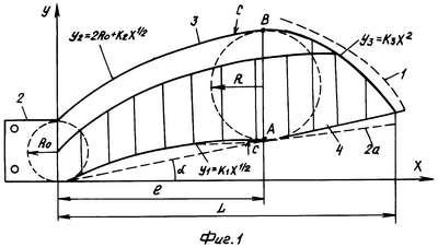 Y1=K1X1/2; Y2=2R0+K2X1/2; Y3=-K3X2 /фиг.1/ или Y1=K1X1/2; Y2=2R0+K2X1/2 /фиг.2/, касающиеся окружности радиусом R R0, центр которой находится на расстоянии l 2/3L, где L – проекция длины лопасти на координату X.