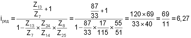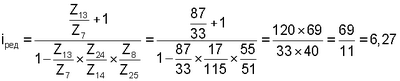 В планетарном механизме: солнечное колесо имеет 33 (тридцать три) зуба, эпицикл – 87 (восемьдесят семь) зубьев, 6 (шесть) сателлитов с 28 (двадцатью восьмью) зубьями на каждом. Следовательно, передаточное отношение планетарного механизма: