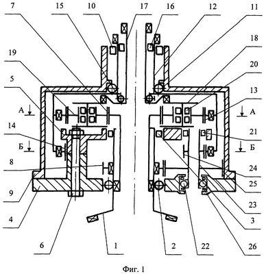 Внутри наружного ведомого вала 12 на подшипниках 15 и 16 установлен внутренний ведомый вал 17. К внутреннему ведомому валу 17 жестко закреплено водило 18, в котором на равных расстояниях по окружности расположены шесть сателлитов 19, а именно прямозубые шестерни внешнего зацепления с 28-ю прямыми корригированными зубьями. Сателлиты 19 установлены с опорой на водило 18 через подшипники 20. Каждый сателлит 19 находится в зацеплении с солнечным колесом 7 и эпициклом 13, образуя планетарный механизм.
