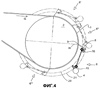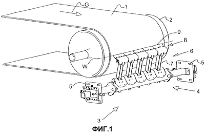 На фиг.1 показано как вокруг барабана 2 – приводной и/или концевой натяжной барабан – проложена конвейерная лента 1, которая находится в обращении по указанному стрелкой G направлению движения конвейерной ленты вокруг барабана 2, в этом случае с углом обхвата примерно в 90°. Барабан 2 обычным способом поворотно смонтирован в подшипниках на непредставленной станине установки ленточного транспортера.