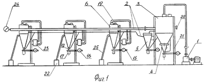 Собираемый в циклоне 5 и бункере 3 порошок своевременно поступает в емкости 17 через трубопроводы 14 конусных затворов 12. Беспрепятственность поступления порошка из бункера 3 поддерживается устройством аэрации 4.