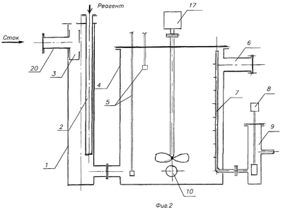 Изобретение относится к устройствам обработки сточных вод и предназначено для выполнения реакций реагентного обезвреживания некоторых видов стоков гальванического производства (хромосодержащих, циансодержащих и т.п.).