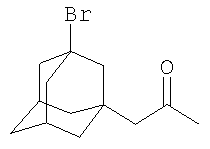 К 9 г (0,066 моль) -бромацетона в атмосфере сухого азота при комнатной температуре прикапывают раствор 3 г (0,022 моль) свежевозогнанного 1,3-дегидроадамантана (соотношение 1,3-ДГА : -бромацетон = 1:3) в 20 мл абсолютного диэтилового эфира, после чего реакционную смесь кипятят при температуре 34-40°С в течение 3 часов, после чего растворитель и избыток -бромацетона удаляют перегонкой в вакууме водоструйного насоса, остаток перегоняют в вакууме и получают 3,7 г (0,0136 моль, 62%) 3-бромадамантил-1-ацетона. Ткип.=196-197°С /20 мм рт.ст., n20 D 1.5358. Спектр ЯМР 1Н, , м.д.: 1,45, 1,63, 2,09 (14 Н, адамантил-1,3), 2,27 с (3Н, СН3), 2,32 с (2Н, СН2С(О)).