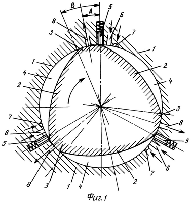 1 – статор, 2 – ротор, 3 – выступ ротора 2, 4 – компрессионная камера всаса и сжатия, 5 – компрессионная плашка в пазу статора, 6 – окно всаса воздуха, 7 – гнездо установки электромагнитной форсунки первого контура, 8 – место подключения форсунки второго контура, угол “В” – расчетное необходимое угловое совпадение поверхности выступа ротора с окружностью статора, угол “А” – расчетный угол размещения места подключения форсунки второго контура и величина смещения второго статора против хода по отношению к первому.