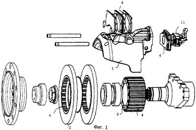 Как показано, дисковый тормоз имеет суппорт 1, который окружает два тормозных диска 2, надетых на ступицу 3. Тормозные диски 2 на внутренней периферии имеют шлицы 4, которые входят в зацепление со шлицами 4 на наружной периферии ступицы 3. Тормозные колодки 8 помещены с возможностью скольжения в суппорт 1 обычным образом. Тормозные колодки 8 управляются посредством упорной пластины 6 и тормозного механизма 11, размещенных в суппорте 1. Тормозной момент передается от дисков 2 к ступице 3 и, таким образом, к колесу посредством шлицов 4 или зубьев, соответственно, тормозных дисков 2 и ступицы 3.