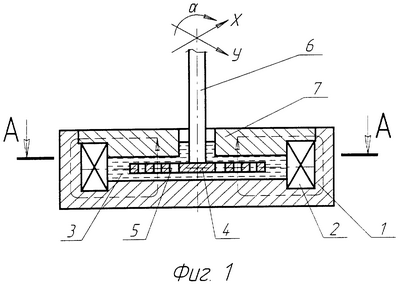 Магнитожидкостный успокоитель состоит из корпуса 1, выполненного из магнитомягкого материала, соленоида 2, размещенного неподвижно внутри корпуса и охватывающего внутреннюю часть корпуса 1, заполненную магнитной жидкостью 3, плоского подвижного элемента 4, выполненного из немагнитного и неэлектропроводного материала со сквозными отверстиями 5, размещенными равномерно по всей плоскости подвижного элемента 4, штока 6, связывающего подвижный элемент с успокаиваемым объектом. Соленоид 2 подключен к регулируемому источнику питания (не показан). Корпус 1 с соленоидом 2 и магнитной жидкостью 3 закрыт крышкой 7 из магнитомягкого материала.