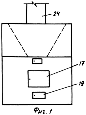 Для достижения и поддержания в топке 15 требуемой температуры не допускается излишний продув объема теплопередачи. При наличии достаточного количества воздуха для горения топлива 2 в топке 15 герметичные дверки 17 и 19, соответственно топки 15 и зольной камеры 10 могут быть полностью закрыты. Поступление необходимого для горения количества воздуха осуществляется через герметичную дверку 19 в зольную камеру 10. Через отверстия 22 в колосниках 9 воздух поступает в зазоры 6 между обмуровкой 8 и котлом 3 и через каналы 5 в конструкции котла 3, к поверхности соприкосновения 7 котла 3 и топлива к структуре топлива 2 через аккумуляторы 18 высокой температуры. Соприкасаясь с аккумуляторами 18 высокой температуры, воздух поступает к структуре топлива раскаленным, что поддерживает температуру горения топлива 2. На распределение воздуха по внутренней структуре топлива 2 оказывает влияние экран 23, препятствуя сквозному проходу воздуха в газоходы. Для начала нагрева топлива 2 в конусе 13 загрузочного бункера 14 используются отводимые по каналам 12 дымовые газы, что приводит к возникновению зоны горения 16 в верхней части топки 15, возникающей при нагреве топлива 2 до температуры воспламенения. При разнице атмосферного давления с верхней точкой дымовой трубы 24 направление тепловых потоков идет от зоны горения 16 через структуру топлива 2 в каналы 5 в конструкции котла 3, далее по зазорам 6 между обмуровкой 8 и котлом 3 по направлению к дымовой трубе 24, по которой выводятся в атмосферу отработанные дымовые газы. Зола проваливается в поддувочную зольную камеру 10 и удаляется через люк 11 выгрузки золы. Теплоноситель подается в пароводогрейный котел 3 по трубе 21 и после нагрева отводится по трубе 4.