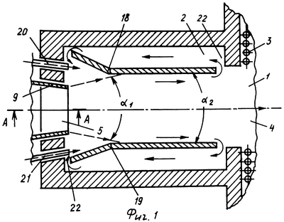При включении дополнительных нагревателей 20 и 21 термоэмиссионные поверхности обтекателей 18 и 19 прогреваются до температуры самовоспламенения пыли. С помощью запальника (не обозначен) воспламеняется легковоспламеняющееся топливо (газ, мазут, соляровое масло или термоуголь), подаваемое в сопло 7, с одновременной подачей воздуха в сопло 8, прогревая все горелочное устройство 5. После прогрева подается тонкодисперсная пыль в растопочном режиме в циркуляционную трубу 6 с помощью шибера 17 по пылепроводу 15 от источника 13 пыли. Пыль воспламеняется в факеле сопла 7 и поступает далее в горелочный насадок 9, который также прогревается горящей пылью. Затем открывается шибер 16 на основном пылепроводе 14, и подается пыль в растопочном режиме в горелочный насадок 9 от источника 12 основной пыли. Проходя по кольцевому зазору 10 пыль прогревается и выделяет горючие летучие, которые воспламеняются от факела, выходящего из циркуляционной трубы 6. Выходя из горелочного устройства 5 пыль соприкасается с термоэмиссионными поверхностями обтекателей 18 и 19. Пыль, невоспламенившаяся в горелочном устройстве 5, воспламеняется при контакте с раскаленными обтекателями 18 и 19, предотвращая проскок невоспламенившейся пыли в топку. После выхода на рабочий режим нагреватели 20 и 21 и сопло 7 отключаются, а воздух продолжает поступать в сопло 8 одновременно с пылью через пылепроводы 14 и 15. При работе горелочного устройства 5 и нагревателей 20 и 21 за счет эжекции факела через вертикальные щелевые зазоры 22 происходит рециркуляция горячих топочных газов и усреднение температуры по всему сечению периферийной камеры 2 сгорания. Это приводит к увеличению тепловой инерцию и повышает термоэмиссию обтекателей, так как горячие топочные газы постоянно рециркулируют внутри периферийной камеры 2 сгорания.