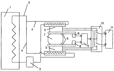 1. Быстрозамораживатель полимерных пакетов, заполненных биологическими медицинскими субстанциями, например плазмой крови, или пищевыми продуктами, например фруктами, содержащий холодильный агрегат с замкнутой гидравлической магистралью, заполненной охлаждающей жидкостью, параллельно присоединенные к этой магистрали гидравлические тракты и полимерные пакеты, контактирующие с пластинами, выполненными из материала с высокой теплопроводностью, отличающийся тем, что в него введены термоэлектрические модули, одной стороной контактирующие с гидравлическими трактами, а другой стороной контактирующие с пластинами, которые, в свою очередь, контактируют с полимерными пакетами, насос, прокачивающий охлаждающую жидкость в замкнутом гидравлическом контуре, при этом термоэлектрические модули, охлаждающие каждый полимерный пакет, снабжены собственным блоком питания, а на пластинах установлены датчики температуры, подключенные к устройству измерения и контроля, которое, в свою очередь, подключено к коммутатору полярности тока, соединенным с блоком питания термоэлектрического модуля.