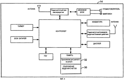 На фиг.4 изображен примерный вариант выполнения беспроводного устройства 14 в соответствии с настоящим изобретением. В соответствии с примерным вариантом выполнения беспроводное устройство 14 включает в себя приложение 30 ведения счетов, которое позволяет производить отслеживание и контроль на индивидуальной основе использования и активности по счету беспроводного устройства 14. Приложение 30 ведения счетов функционирует как многочисленные виртуальные бумажники и способно вести несколько различных счетов, на которые начисляется плата за вызовы или транзакции, обрабатываемые беспроводным устройством 14. Различные счета включают в себя, например, традиционный счет с отсроченной оплатой, счет контролируемого или управляемого использования с отсроченной оплатой и предоплаченный счет.