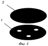 Когда требуется изготовление источников не круглой, а другой формы, тигель может быть не круглым, а соответствующей формы. В некоторых случаях требовалось изготовление источников сложной формы, например три пятна малого диаметра на одной круглой подложке. В этом случае на подложку накладывали маску – фольгу из титана и циркония (Фиг.3), на которую возгоняемое вещество не осаждается. Во время проведения процесса маска плотно прилегала к подложке. На Фиг.3 показаны части крышка тигля для приготовления тонких слоев определенной формы: 1 – маска из титана или циркония; 2 – подложка из другого материала для осаждения возогнанного вещества.