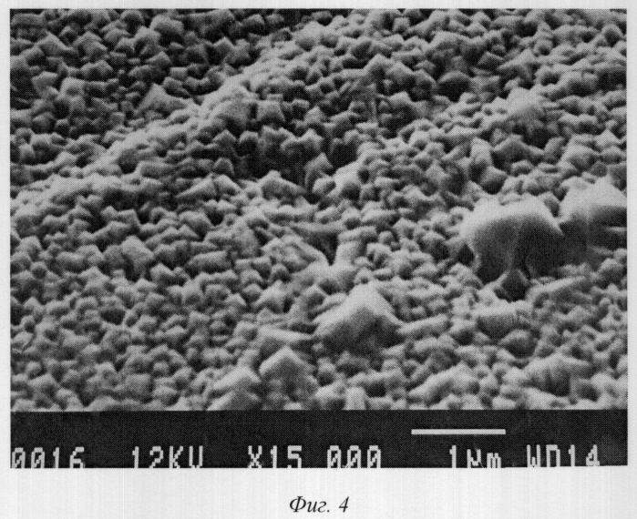 Возгонку макроколичеств миллиграммовых количеств Tm осуществляют следующим образом. В тигель из металлического циркония диаметром 10 мм вносят 1 мг туллия в виде нитрата. Нагревание проводят в течении 2 час при 1200°С. Осаждение проводят на подложку из металлического тантала (толщина 100 мкм). Образовавшийся толстый слой оксида ввиду высокого качества и равномерности не был заметен на поверхности и совершенно прозрачен, внешний вид танталовой поверхности визуально почти не изменился. Рентгено-флуоресцентный анализ (РФА) показал наличие тулия на поверхности тантала в количестве 1 мг/см2. На Фиг.4 показана фотография поверхности с осажденным тулием, сделанная с помощью электронного микроскопа (увеличение 15000). Типичный размер зерен – 0.2-0.3 мкм. Структура осажденного слоя повторяет структуру металлической подложки из тантала. Также наблюдалась хорошая адгезия к поверхности. Данная поверхность, очевидно, состоит не из металлического тулия, так как этот элемент должен легко возгоняться и не мог осаждаться при 1200°С. Полученная прозрачная поверхность не коррелировала на воздухе. Для сравнения были изготовлены пленки оксида тулия методом электроосаждения. Поверхность была белой и рыхлой, а анализ на электронном микроскопе показал, что дефекты на поверхности имели нерегулярную форму и были на порядок большего размера, чем в образце, полученном возгонкой.