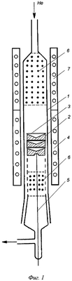 Внутрь трубки помещают один или несколько тиглей из титана или циркония (2). Тигли непосредственно перед процессом очищали механически и прогревали в токе чистого гелия при высокой температуре 1000-1200°С. Таких тиглей может быть и большее количество, что позволяет приготовлять много источников за одно нагревание. На Фиг.1 показана наиболее типичная вертикальная компоновка.