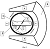 Как известно, сила, действующая между полюсами с магнитными потоками Ф1 и Ф2 на сравнительно большом расстоянии d, равна F=Ф1Ф2/4 0d2, где 0 – абсолютная магнитная проницаемость ( 0=8,85.10-12 Ф/м). Намагниченность ферромагнитного кольца ротора 3, образованная соответствующими магнитами 1 и 4, может быть эквивалентно представлена как действие образованных магнитов на соответствующих участках кольца – соответственно на наружной части кольца вблизи магнита 1 (зона А на фиг.2) и на внутренней части кольца вблизи магнита 4 (зона В на фиг.3, в низшей точке кольца). При этом можно полагать, в первом приближении, что произведение магнитных потоков Ф1 Ф2, образованных между указанными полюсами наведенных в кольце магнитов и магнитами 4 и 1 соответственно, в обоих случаях взаимодействия оказывается одинаковым. Однако расстояние между областью максимальной намагниченности кольца, вызванной действием первого (внутреннего) постоянного магнита 1, несколько больше радиуса кольца d1>R, a расстояние между областью максимальной намагниченности кольца, вызванной действием второго (внешнего) постоянного магнита 4, несколько меньше величины (2)1/2 R, то есть d2<1,41 R. Следовательно, силы взаимодействия между соответствующими парами полюсов отличаются между собой почти в 2 раза, так как (d2/d1)2 2. Кроме того, сила F1 ортогональна радиусу кольца R, а сила F2 – суть проекция на касательную к радиусу кольца от силы, действующей под углом, близким к /4, то есть составляет от последней часть около 0,707 ее значения. Для идеализированного случая тонкого ферромагнитного кольца с минимальными зазорами между магнитами 1 и 4 и кольцом ротора 3 получаются соотношения сил F2/F1=0,707/2=0,353, что означает в этом случае превышение вращающего момента M1 над вращающим моментов М2 почти втрое, тогда М=0,646 M1=0,646 F1R=0,162 Ф1Ф2/ 0R, где Ф1 – магнитный поток с наружного участка кольца максимальной намагниченности, расположенного вблизи первого постоянного магнита 1, а Ф2 – аналогичный магнитный поток, образованный вторым постоянным магнитом 4. Корректное решение задачи по определению сил F1 и F2 обеспечивается интегрированием с учетом конфигурации магнитных силовых линий и топологии магнитных полюсов 1 и 4 и распределения напряженности магнитного поля в ферромагнитном кольце ротора 3, поэтому вышеприведенная оценка является лишь приблизительной, качественной, не претендующей на строгость.