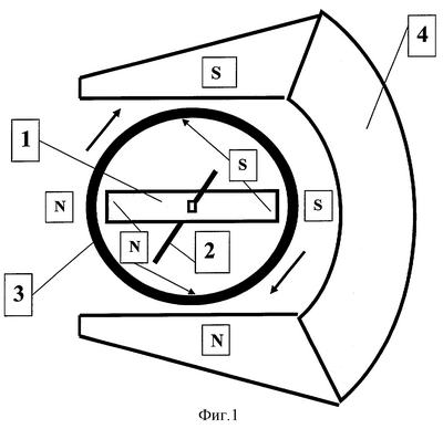 Устройство одного из вариантов построения магнитного двигателя с вращающимся ротором из ферромагнитного вещества в форме кольца представлено на фиг.1. Оно состоит их внутреннего первого постоянного магнита 1, вращающегося на оси 2 кольцевого ротора 3 из ферромагнитного вещества и внешнего второго постоянного магнита 4, причем магниты 1 и 4 закреплены неподвижно, а их магнитные поля взаимно ортогональны в области расположения ротора 3. Магнитные зазоры между магнитами 1 и 4 и ротором 3 выбраны минимальными, а магнитная индукция магнитов 1 и 4 определяет энергетику устройства.
