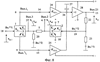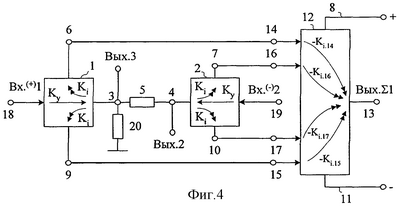 Графики, показывающие взаимосвязь коэффициентов передачи к различным выходам для схемы фиг.9 при ее включении, соответствующем фиг.8 и при 100% обратной связи (R22/R23=0), а также при R5/R10=1, приведены на фиг.14-16, где обозначено: