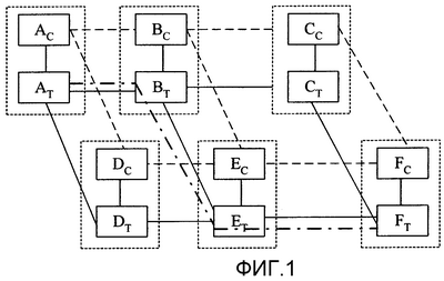 Решение согласно данному изобретению описано далее со ссылкой на пример, показанный на фиг.1. Оптическая сеть, показанная на фиг.1, содержит шесть узлов: узел А – узел F, и каждый из узлов имеет плоскость передачи AT-FT и контрольную плоскость AC-FC соответственно, при этом плоскость передачи и контрольная плоскость могут быть физически разделены или физически объединены, но логически разделены. Каждый узел также содержит плоскость управления, что делает плоскость передачи и контрольную плоскость управляемой системой управления сетью. Для упрощения плоскости управления не показаны на фиг.1. Узлы соединены оптическими линиями связи, которые показаны на фиг.1 прямыми линиями. Фактические контрольные плоскости узлов сообщаются друг с другом посредством контрольных линий связи, которые показаны на фиг.1 пунктирными линиями. Каналы контрольных линий связи являются логическими и могут быть конкретно реализованы различными способами, например, с помощью дополнительных служебных байтов в SDH/Sonet. Здесь нормальные соединения оптических линий связи установлены между каждым узлом оптической сети, и контрольные плоскости установили нормальный сеанс с соседними узлами через контрольные каналы. Посредством протокола управления линией связи каждый узел получает свои соединения оптических линий связи с соседними узлами, и соединения соседних узлов с оптическими линиями связи распространяются посредством основанного на состоянии линии связи протокола маршрутизации, создавая в итоге в каждом узле согласованную “карту сети”, которая включает в себя все сетевые узлы, соединение линий связи между ними и информацию о ресурсах линий связи. Помимо этого, предусмотрена таблица перекрестных соединений в каждом узле, которая записывает соединения каждого порта и канала в этом узле. Более того, в сети имеется созданное соединение A-B-E-F, которое показано на фиг.1 штрихпунктирной линией. В этой сети упомянутая контрольная плоскость обычно основана на протоколе TCP/IP, и переход между постоянным соединением и коммутируемым соединением реализован посредством использования протокола передачи сигналов RSVP-TE или протокола передачи сигналов CR-LDP.